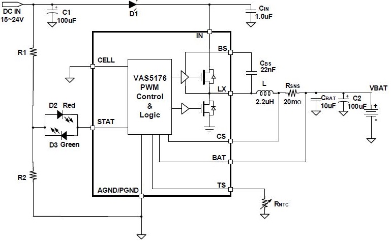 VAS5176 是一款8.5V-24V 輸入,高度集成的開關(guān)型鋰離子/聚合物電池充電芯片, 以高精度調(diào)節(jié)2A充電電流,和電池電壓。它密切監(jiān)測電池組的溫度只在設(shè)置安全溫度范圍下允許充電,還提供電池檢測、預(yù)充電調(diào)節(jié)、充電飽充和充電狀態(tài)指示等功能。熱反饋調(diào)節(jié)可降低充電電流并維持芯片內(nèi)部溫度以不超過125°C 的條件下工作,如果結(jié)溫超過155°C,它將進(jìn)行過熱關(guān)斷保護(hù),停止工作以確保可靠度。