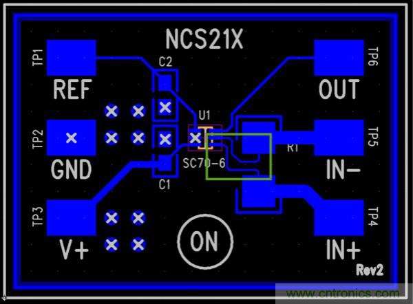 圖1:NCS21xR客戶評估PCB布板提供優(yōu)化的并聯(lián)電阻連接