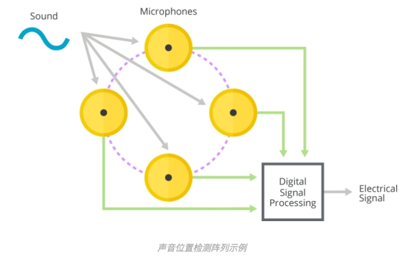 MEMS麥克風(fēng)陣列還可用于確定聲音相對于陣列的方向。在本應(yīng)用的一種常見實(shí)現(xiàn)中,麥克風(fēng)會(huì)被放置在圓圈或球面的周邊上。采用電子信號處理識別各個(gè)麥克風(fēng)發(fā)出的所需信號,同時(shí)可以借助在各個(gè)麥克風(fēng)之間傳送的所需信號的相對時(shí)間延遲,確定相對于麥克風(fēng)陣列的聲音源。