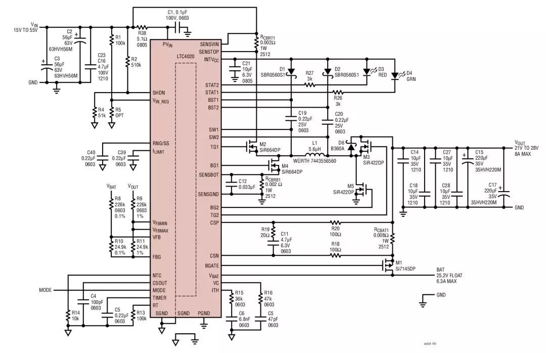 圖 1 示出了一個(gè) 15V 至 55V 輸入、25.2V/6.3A 降壓-升壓電池充電器,其具有一個(gè)高效率四開(kāi)關(guān) (M2~M5) 同步降壓-升壓型 DC/DC 轉(zhuǎn)換器,僅需一個(gè)電感器 (L1)。專有的平均電流模式架構(gòu)采用兩個(gè)檢測(cè)電阻器 (RCBRT1 和 RCBRB1) 來(lái)監(jiān)視電感器電流。在該降壓-升壓型解決方案中,當(dāng) VIN高于 VOUT時(shí),轉(zhuǎn)換器在降壓模式工作;當(dāng) VIN 低于 VOUT 時(shí),轉(zhuǎn)換器則工作在升壓模式。當(dāng) VIN 接近 VOUT 時(shí),轉(zhuǎn)換器工作于四開(kāi)關(guān)降壓-升壓模式。