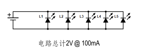 | 電路的接線方式?jīng)Q定了電路正常工作所需的電壓和電流。下方兩條電路使用了五個160-1445-1-ND 2 LED。這是一個2V 20mA LED。如您所見,操作每條電路所需的電壓和電流之間存在顯著差異。