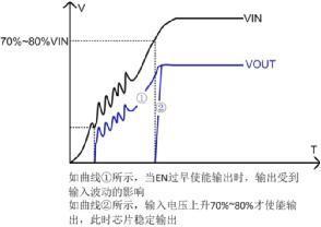 l如曲線②所示,輸入電壓VIN上升到70%~80%的時(shí)候,VEN才到達(dá)使能閾值,此時(shí)芯片輸出摒除了輸入電源的不穩(wěn)定階段,上電迅速,輸出平穩(wěn),減小了輸入電壓波動(dòng)的影響;