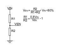 l由此可知將電源芯片的EN閾值電壓通過(guò)分壓網(wǎng)絡(luò)設(shè)定在70%~80%×VIN是較為合理的,EN閾值可以通過(guò)芯片手冊(cè)查得。如下圖3所示,根據(jù)已知的EN閾值和輸入電壓即可求得合適的分壓電阻比例。