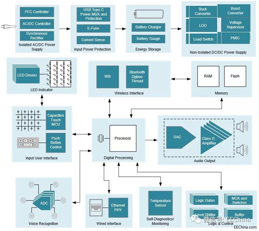 但相比于與互聯(lián)網(wǎng)接口結(jié)合使用的麥克風(fēng)和揚(yáng)聲器, 這些外形看似簡(jiǎn)單的設(shè)備往往更復(fù)雜。智能音箱包含許多電子功能,這些功能均通過采用數(shù)十種復(fù)雜的集成電路(IC) 來實(shí)現(xiàn)。原始設(shè)備制造商 (OEM) 憑借差異化產(chǎn)品進(jìn)入智能揚(yáng)聲器市場(chǎng),他們必須決定要提供哪些設(shè)備、如何進(jìn)行提供以及此類小型低功耗設(shè)備中可采用的折衷方案。