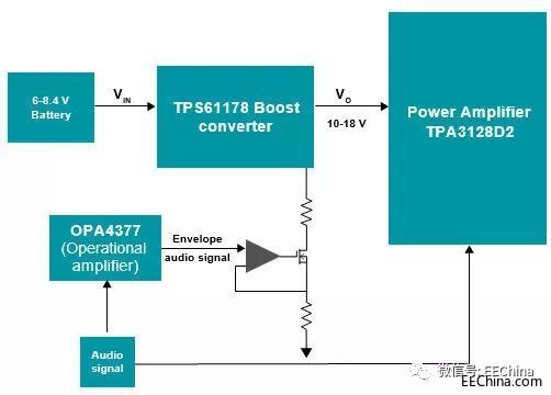 為了提高效率,您也可以根據(jù)內(nèi)容動(dòng)態(tài)調(diào)整放大器的輸出電源電壓。這種技術(shù)稱為包絡(luò)跟蹤。它僅在音樂 需要提高功率時(shí)跟蹤音頻內(nèi)容并提高電壓(輸出功 率),特別是在重低音部分(信號(hào)內(nèi)容中有許多峰值)。