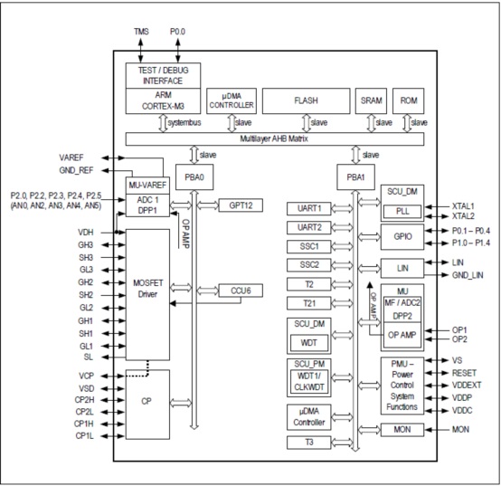 It includes six fully integrated NFET drivers optimized to drive a 3-Phase motor via six external power NFETs, a charge pump enabling low voltage operation and programmable current along with current slope control for optimized EMC behavior. Its peripheral set includes a current sensor, a successive approximation ADC synchronized with the capture and compare unit for PWM control and 16-bit timers. A LIN transceiver is also