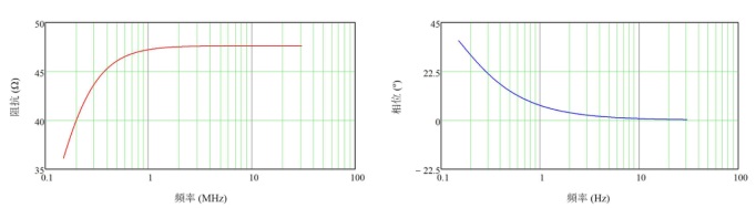 圖 4:在 150kHz 至 30MHz 的調(diào)節(jié)頻率范圍內(nèi),測量端口處的 50Ω,50μH LISN 標(biāo)稱阻抗特性。