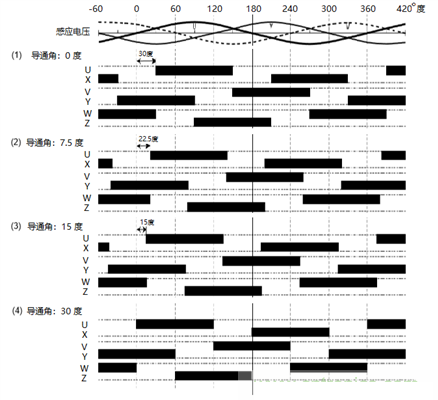 一般來說,特別是無刷電機(jī)BLDC梯形波控制算法,在電機(jī)高轉(zhuǎn)速情況下,需要在每個(gè)換相點(diǎn)前對(duì)6個(gè)PWM輸入信號(hào)(U~Z)插入一定的Lead Angle超前角/導(dǎo)通角,圖4是不同超前角/導(dǎo)通角,從0度、7.5度、15度到30度,所分別對(duì)應(yīng)的輸入信號(hào)。