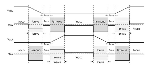 圖 6:在某個(gè)三相 BLDC 電機(jī)的 MOSFET 橋中,高壓側(cè) (VGHx) 和低壓側(cè)晶體管 (VGLx) 的電壓和電流輸入。IDRIVE 和 tDRIVE 對(duì)于電機(jī)是否正常運(yùn)行及效率非常重要;IHOLD 用于將柵極維持在所需狀態(tài);ISTRONG 用于防止低壓側(cè)晶體管的柵極至源極電容出現(xiàn)導(dǎo)通。(圖片來(lái)源:Texas Instruments)