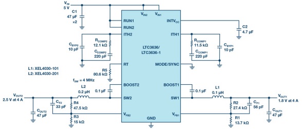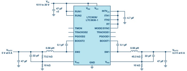 設(shè)計(jì)人員面臨的問題不僅僅是找到一個(gè)在有限空間放得下的穩(wěn)壓器。緊湊型解決方案的要求往往與其他先進(jìn)的電子產(chǎn)品要求相沖突:可靠的設(shè)計(jì)、高效率、大轉(zhuǎn)換比、高功率、小尺寸以及良好的熱性能。其中許多要求需要在其他領(lǐng)域進(jìn)行權(quán)衡,這就給設(shè)計(jì)人員帶來了一個(gè)困難且耗時(shí)的優(yōu)化問題。LTC3636旨在通過雙通道6 A降壓穩(wěn)壓器簡化設(shè)計(jì)人員的任務(wù),該穩(wěn)壓器在關(guān)斷時(shí)消耗非常低的待機(jī)電流,在高達(dá)4 MHz的頻率下工作時(shí),滿載和輕載時(shí)都具有很高的效率。