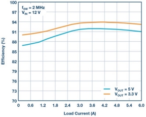LTC3636穩(wěn)壓器具有低靜態(tài)電流,可在輸出電壓高達(dá)5 V時(shí)實(shí)現(xiàn)高效率。而LT3636-1型號(hào)將VOUT范圍擴(kuò)大至12 V。該降壓穩(wěn)壓器能夠在3.1 V至20 V的輸入電壓范圍內(nèi)工作,同時(shí)每通道提供高達(dá)6 A的輸出電流。圖3顯示的是一個(gè)高效率解決方案,而圖4顯示,其測得的效率在整個(gè)工作范圍內(nèi)一直很高。