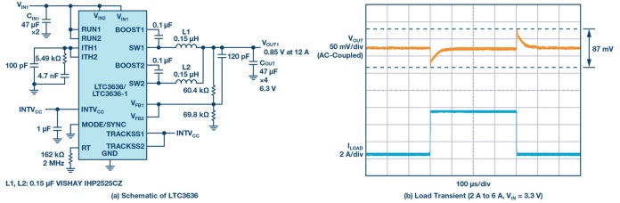 先進(jìn)的SoC和FPGA電子系統(tǒng)在汽車、交通和工業(yè)應(yīng)用中的激增需要更高性能的電源。這些先進(jìn)SoC的功率需求不斷增加,基于傳統(tǒng)PWM控制器和MOSFET的解決方案必須采用單片穩(wěn)壓器,以便獲得更小的尺寸、更高的電流能力和更高的效率。LTC3636旨在滿足這些先進(jìn)的SoC功率需求,同時(shí)滿足SoC對(duì)方案尺寸和散熱的限制。圖5a顯示兩通道并行的電源的原理圖,在0.85 V的電壓下提供高達(dá)12 A電流。當(dāng)VIN為3.3 V時(shí),12 A輸出負(fù)載的峰值效率為87%。負(fù)載瞬變?nèi)鐖D5b所示。在此設(shè)計(jì)中,F(xiàn)B1和FB2引腳連接在一起,和RUN1和RUN2引腳一樣。ITH1和ITH2引腳連接在一起,并設(shè)置外部補(bǔ)償以最大限度地減少穩(wěn)定狀態(tài)下的電流失配以及瞬變。