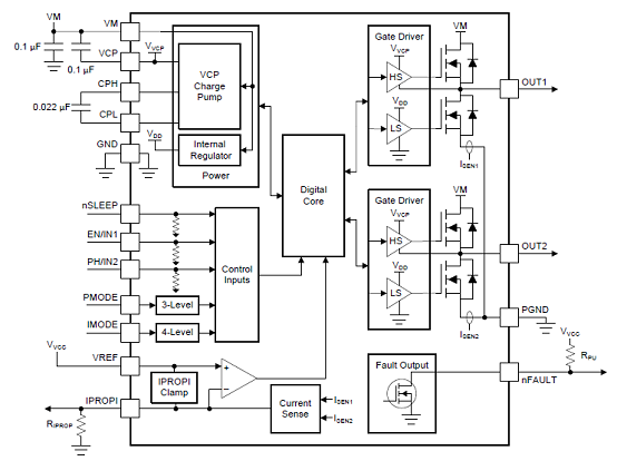 A low-power sleep mode is provided to achieve ultralowquiescent current draw by shutting down most ofthe internal circuitry. Internal protection features areprovided for supply undervoltage lockout (UVLO),charge pump undervoltage (CPUV), outputovercurrent (OCP), and device overtemperature(TSD). Fault conditions are indicated on nFAULT.