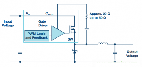 【圖2. 使用自舉電阻減慢異步降壓轉換器中的開關轉換!