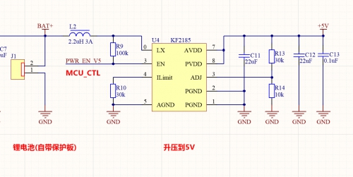 接下來,我們就來看下升壓部分的電路,鋰電池升壓部分筆者采用了一顆型號為KF2185的同步升壓芯片,這款芯片的同步升壓效率最高可達(dá)94%,持續(xù)帶載能力可以達(dá)到2A以上,可調(diào)節(jié)電壓輸出,外圍電路也是很簡單。