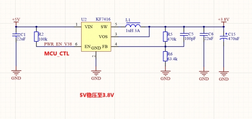 接下來,就是3.8V的穩(wěn)壓芯片,筆者這里選用的也是一款可以電壓輸出的芯片KF7416,這款芯片的轉(zhuǎn)換效率也是最高可達(dá)到95%,外圍電路也是非常的簡單,SOT23-6的封裝,也算是很節(jié)省空間了。