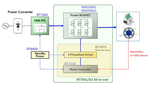 Richtek為市場提供的直流無刷電機驅動解決方案由電機控制器、門極驅動器、功率元件等產品以及由電機控制器和門極驅動器集成在一起的二合一產品和將電機控制器、門極驅動器及功率元件都集成在一起的三合一產品組合而成。組成完整的電機控制系統(tǒng)所需要的PFC控制器、電源轉換器等產品也都齊備,因而可以滿足用戶在應用上的所有需求。