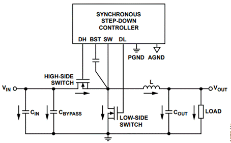 圖1所示為一個(gè)同步降壓調(diào)節(jié)器設(shè)計(jì),它包括一個(gè)開關(guān)控制器和以下外部電源器件:高端開關(guān)、低端開關(guān)、電感、輸入電容、輸出電容和旁路電容。圖1中的箭頭表示高開關(guān)電流流向。必須小心放置這些電源器件,避免產(chǎn)生不良的寄生電容和電感,導(dǎo)致過大噪聲、過沖、響鈴振蕩和接地反彈。