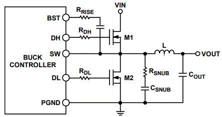 在DH或DL引腳上串聯(lián)一個(gè)小電阻(約2 Ω至4 Ω)可以減慢柵極驅(qū)動(dòng),從而也能降低柵極噪聲和過沖。另外,BST與SW 引腳之間也可以連接一個(gè)電阻(參見圖6)。在布局期間用0 Ω柵極電阻保留空間,可以提高日后進(jìn)行評估的靈活性。增加的柵極電阻會延長柵極電荷上升和下降時(shí)間,導(dǎo)致 MOSFET的開關(guān)功率損耗提高。