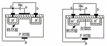 耗盡型MOS場(chǎng)效應(yīng)管,是在制造過程中,預(yù)先在SiO2絕緣層中摻入大量的正離子,因此,在UGS=0時(shí),這些正離子產(chǎn)生的電場(chǎng)也能在P型襯底中“感應(yīng)”出足夠的電子,形成N型導(dǎo)電溝道。