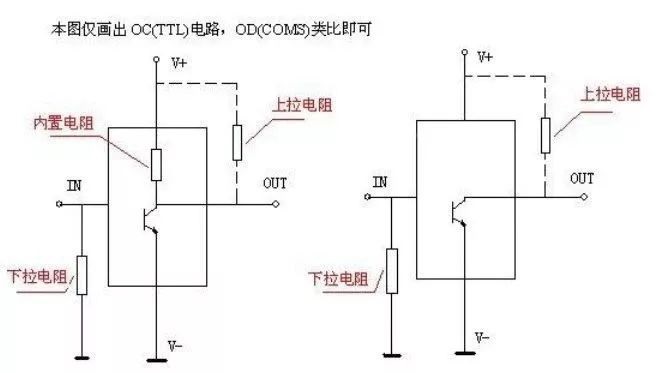 當(dāng)TTL電路驅(qū)動CMOS電路時,如果TTL電路輸出的高電平低于CMOS電路的最低高電平,這時就需要在TTL的輸出端接上拉電阻,以提高輸出高電平的值;OC門電路必須加上拉電阻,以提高輸出的高電平值。