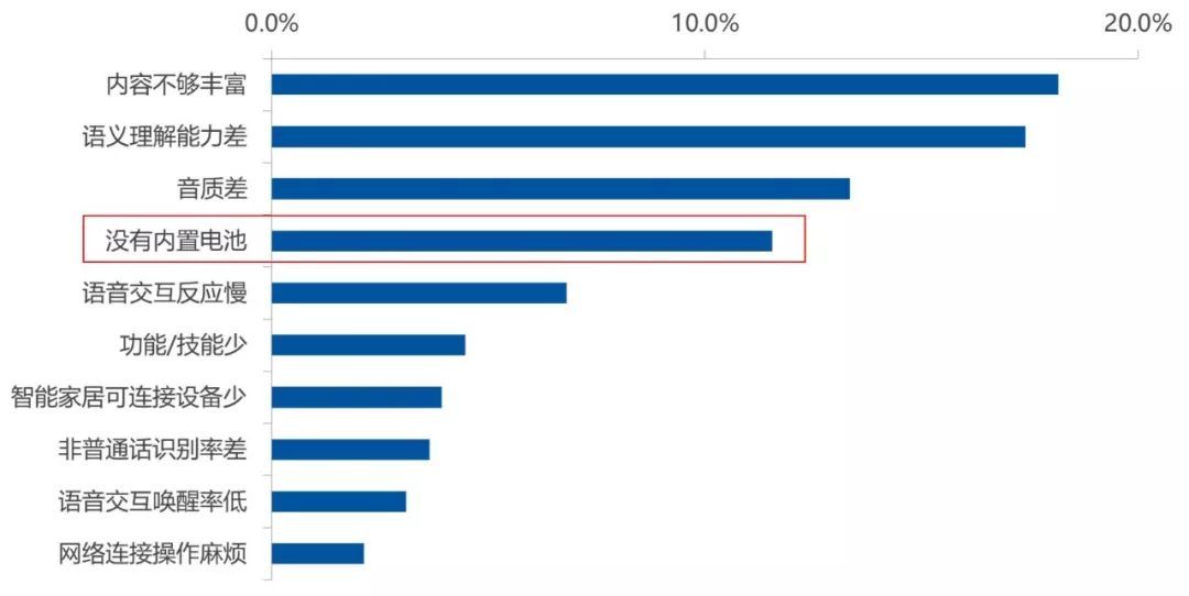 根據(jù)奧維云網(wǎng)(AVC)挖掘的主流電商平臺(tái)重點(diǎn)智能音箱品牌的消費(fèi)者評(píng)價(jià)數(shù)據(jù)顯示,不帶電池的差評(píng)占比達(dá)到11.6%,排在第四位。沒有內(nèi)置電池,意味著只能插電使用,不能自由移動(dòng)及隨身攜帶,使用場景大大受到限制。從機(jī)型看,小巧的機(jī)型在沒有電池方面的差評(píng)要高于其他機(jī)型。