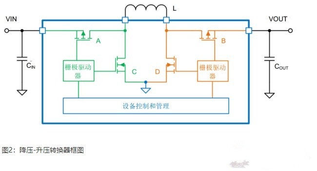 降壓-升壓轉換器將降壓轉換器(圖1中的綠色部分)與升壓轉換器(圖1中的橙色部分)合并在同一結構中,從而可以有效地升高和降低輸出電壓?刂骗h(huán)路可以根據實際的輸入電壓和編程設定的輸出電壓來決定設備是否需要在降壓或升壓模式下運行。