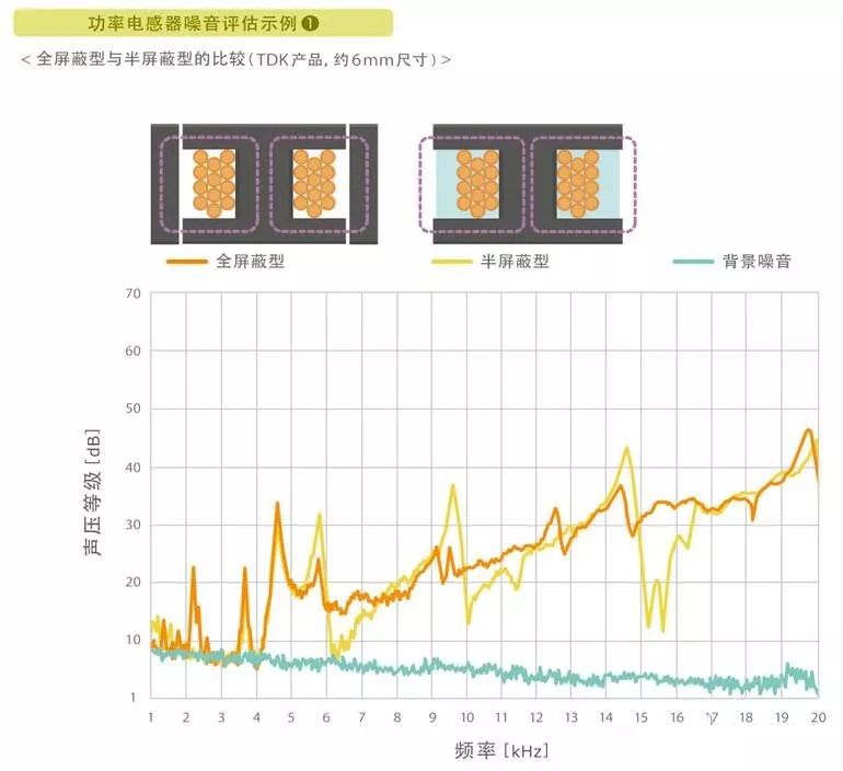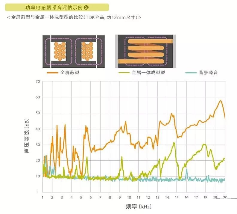 比較全屏蔽型與金屬一體成型型產(chǎn)品時,其中的差異較為顯著。全屏蔽型中,在大范圍的頻帶內(nèi)產(chǎn)生有30~50dB左右水平的噪音。而在金屬一體成型型中,在大范圍頻帶內(nèi),其與背景噪音處于同等低的水平,即使在峰值部位,其與全屏蔽型相比也抑制了大約20dB。抑制20dB也就意味著僅為10分之1的水平,由此可見,置換為金屬一體成型型是有效的對策。