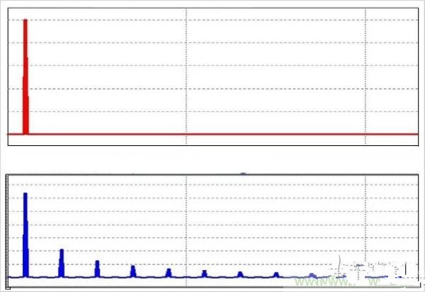 讓我們假設(shè)我們有一個由完美的5 kHz正弦波組成的音頻信號。我們知道時域中的正弦波是什么樣的,在頻域中我們只能看到5 kHz的頻率“尖峰”。現(xiàn)在讓我們假設(shè)我們激活一個500 kHz振蕩器,將高頻噪聲引入音頻信號。在示波器上看到的信號仍然只是一個電壓序列,每個時刻有一個值,但信號看起來會有所不同,因?yàn)樗臅r域變化現(xiàn)在必須反映5 kHz正弦波和高頻噪音波動。然而,在頻域中,正弦波和噪聲是在該一個信號中同時存在的單獨(dú)的頻率分量。正弦波和噪聲占據(jù)了信號頻域表示的不同部分(如下圖所示),這意味著我們可以通過將信號引導(dǎo)通過低頻并阻擋高頻的電路來濾除噪聲。