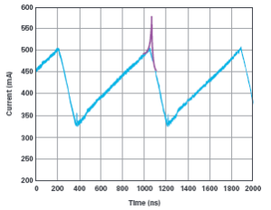 用分流電阻代替電流箝位進(jìn)行測(cè)量將會(huì)出現(xiàn)強(qiáng)耦合噪聲,尤其是在峰值電流處,這使得電感飽和的檢測(cè)非常困難。