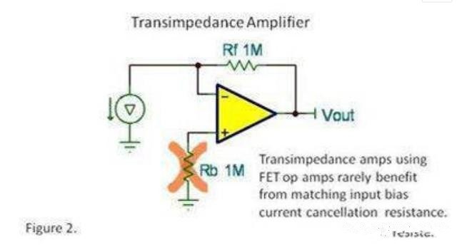 跨阻抗應(yīng)用通常利用高反饋電阻器值來對(duì)非常小的電流進(jìn)行放大處理。因此,您可能會(huì)忍不住要添加 Rb 來平衡兩個(gè)輸入端的電阻。但是,這些應(yīng)用一般使用FET 或者 CMOS 輸入運(yùn)算放大器。由于它們的輸入偏置電流非常低,因此偏移誤差一般也非常小。