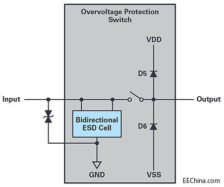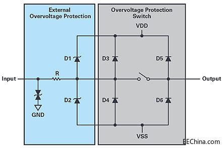 ADC)、運算放大器等,通常都內(nèi)置保護功能。如圖1右側所示,此保護功能由開關架構構成。從圖1還可以看出,電源軌兩側都配有輸入端和輸出端保護二極管。這種設置存在缺點,當浮動信號在斷電狀態(tài)(IC沒有通電)下出現(xiàn)時,開關可能會像處于活動狀態(tài)一樣(即使設置為關閉),電流會流經(jīng)二極管和電源軌。這種現(xiàn)象將允許電流通過信號線路,導致信號線路失去保護。