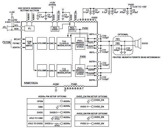 The SSM3582A is a fully integrated, high efficiency, digital input stereo Class-D audio amplifier. The device can operate from a single supply and requires only a few external components, significantly reducing the circuit bill of materials.