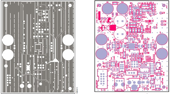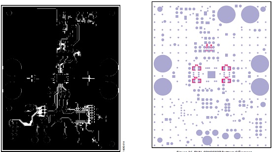圖12.評(píng)估板EVAL-SSM3582Z PCB設(shè)計(jì)圖:左: 頂層,銅;右:第二層,銅