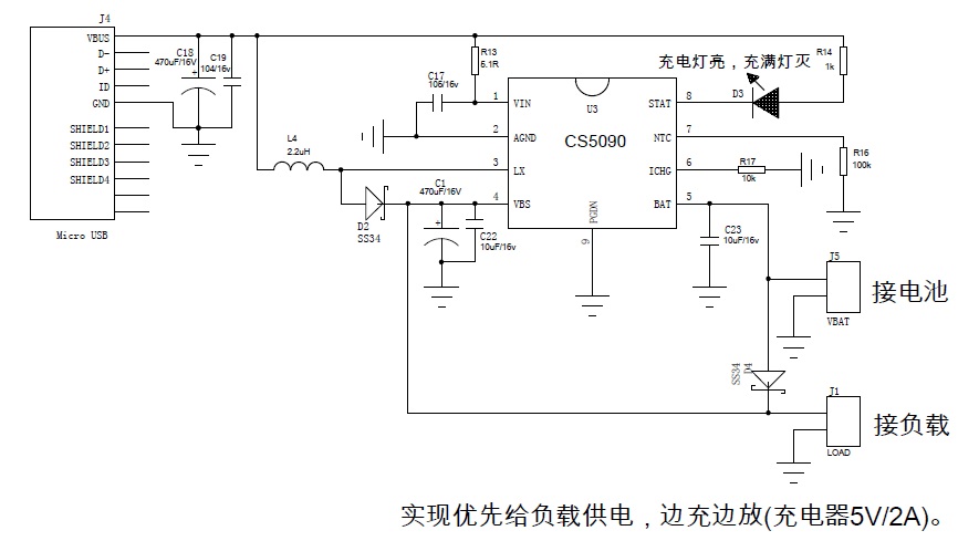 | CS5090 5V USB輸入兩節(jié)鋰電升壓充電管理IC帶電源路徑管理應用原理圖,滿足藍牙音箱邊充邊放 |