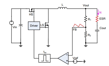 需要注意的是,反饋電壓會直接輸入到比較器中,以驅(qū)動定時(shí)控制塊,沒有誤差放大器或內(nèi)部固定頻率會導(dǎo)致延遲從而影響瞬態(tài)響應(yīng)時(shí)間。