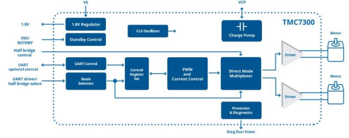 Trinamic的TMC7300是公司的第二個用于低壓應用的IC。 具有基于UART的扭矩和速度控制功能的電源驅(qū)動器,可以用2(1.8)…11V直流電驅(qū)動最多兩個直流電機。