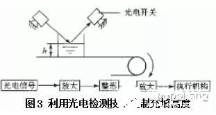 用容積法計(jì)量包裝的成品,除了對(duì)重量有一定誤差范圍要求外,一般還對(duì)充填高度有一定的要求,以保證商品的外觀質(zhì)量,不符合充填高度的成品將不許出廠。圖3所示為借助光電檢測(cè)技術(shù)控制充填高度的原理。當(dāng)充填高度h偏差太大時(shí),光電接頭沒有電信號(hào),即由執(zhí)行機(jī)構(gòu)將包裝物品推出進(jìn)行處理。