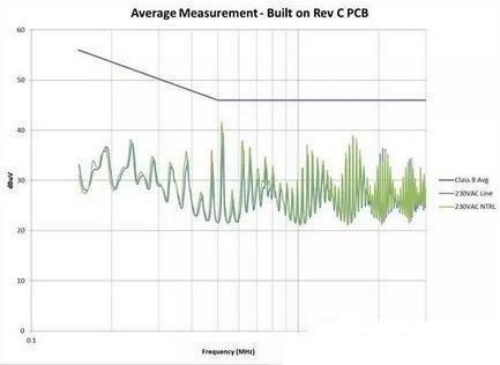 圖 3:從電路板布局進(jìn)行 EMI 掃描,其中 AC 輸入與開關(guān)電路之間距離較大