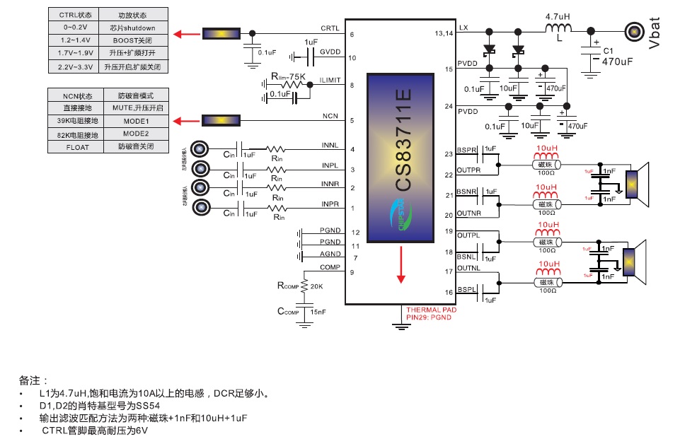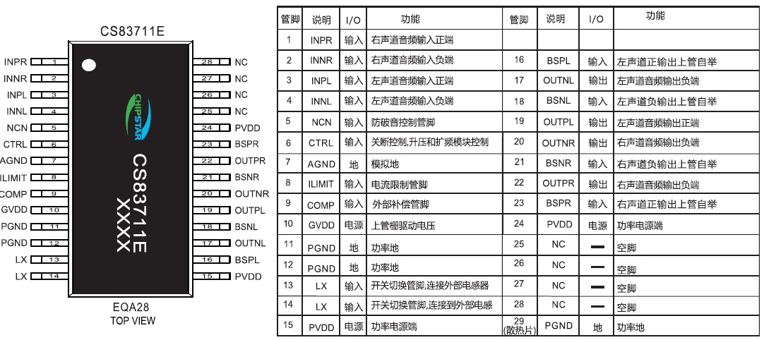 CS83711E的全差分架構(gòu)和極高的PSRR有效地提高了CS83711E對RF噪聲的抑制能力。無需濾波器的PWM調(diào)制結(jié)構(gòu)及內(nèi)置的BOOST升壓模塊,以及CS83711E采用專有的AERC(Adaptive Edge Rate Control)技術(shù) ,在音頻全帶寬范圍內(nèi)極大地降低了EMI的干擾,對60cm的音頻線,在FCC的標(biāo)準(zhǔn)下具有超過20dB的裕量,另外CS83711E內(nèi)置了過流保 護(hù),短路保護(hù)和過熱保護(hù),有效的保護(hù)芯片在異常的工作條件下不被損壞。