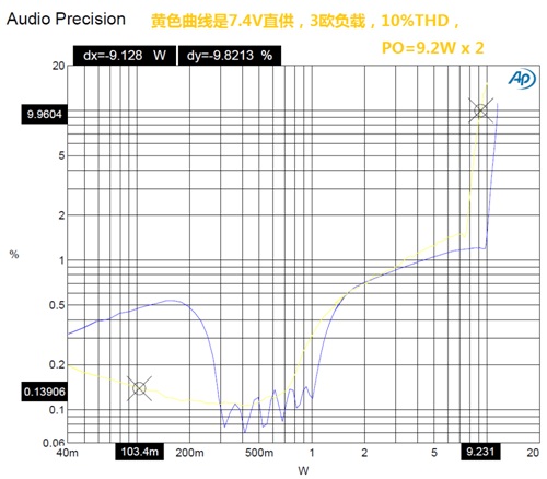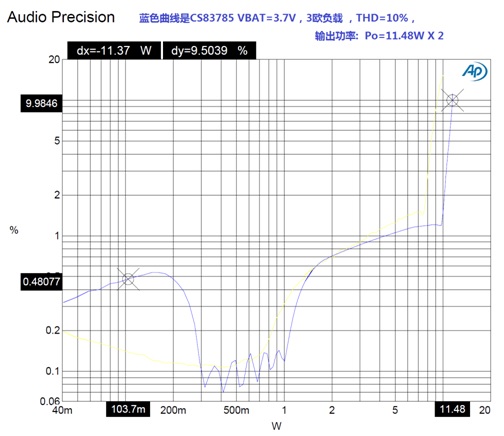 1. CS83785 3.7V供電對(duì)比普通音頻功放7.4V直供輸出功率,實(shí)測(cè)CS83785功率大2W以上: