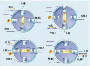 接著,我們?cè)賹⒗@組2的電流切斷,按照?qǐng)D2c的方向給繞組1輸送電流,注意:這時(shí)繞組1中的電流流向與圖2a所示方向相反。于是定子的磁場(chǎng)北極就會(huì)指向下,從而導(dǎo)致轉(zhuǎn)子旋轉(zhuǎn),其南極也指向下方。