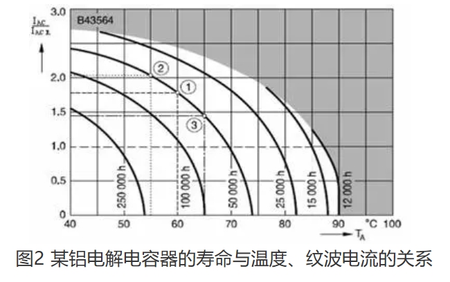 另一方面,電解電容器的壽命還與電容器長時間工作的交流電流與額定脈沖電流(一般是指在85℃的環(huán)境溫度下測試值,但是有一些耐高溫的電解電容器是在125℃時測試的數(shù)據(jù))的比值有關(guān)。一般說來,這個比值越大,電解電容器的壽命越短,當(dāng)流過電解電容器的電流為額定電流的3.8倍時,電解電容器一般都已經(jīng)損壞。所以,電解電容器有它的安全工作區(qū),對于一般應(yīng)用,當(dāng)交流電流與額定脈沖電流的比值在3.0倍以下時,對于壽命的要求已經(jīng)滿足。環(huán)境溫度和紋波電流對電解電容器的影響如圖2所示。