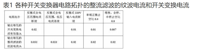 影響電解電容器性能的最主要的參數(shù)之一就是紋波電流問題。紋波電流對鋁電解電容器的影響主要是在ESR上產(chǎn)生功耗使鋁電解電容器發(fā)熱,進(jìn)而縮短使用壽命。 從特性曲線中(圖2)可以看到,紋波電流在ESR上產(chǎn)生的損耗與紋波電流有效值的平方成正比,因而隨著紋波電流的增加,小時壽命曲線類似于拋物線函數(shù)曲線。降低紋波電流的方法可以采用較大容量的鋁電解電容器,畢竟大容量鋁電解電容器可承受的紋波電流比小容量的鋁電解電容器大;也可以采用多只小容量鋁電解電容器的并聯(lián)方式,還可以選用紋波電流低的電路拓?fù)浣Y(jié)構(gòu)。一般而言,反激式變換器產(chǎn)生的開關(guān)變換電流相對最大。表1是各種開關(guān)變換器電路拓?fù)涞闹绷麟娏、整流濾波的紋波電流、開關(guān)變換電流和濾波電容上的總紋波電流。