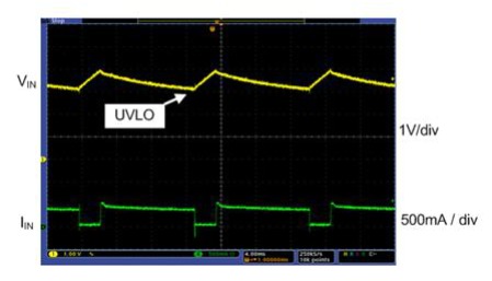 通常與DPPM混淆的另一個功能是VIN-DPM。這一機制聽起來非常相似,但重點卻完全不同。輸入電源或適配器具有額定功率。在某些情況下,輸入電源的功率并不足以滿足設(shè)備的需求。在USB標準不同的情況下,如今設(shè)計人員更普遍地認識到了這一點。正在充電的設(shè)備可能需要適用于各種類型(甚至未知的)適配器。如果輸入源過載并導致輸入電壓低于欠壓鎖定(UVLO)閾值,則器件會關(guān)閉并停止充電。電源負載消失,適配器恢復(fù)。其電壓回升到高于UVLO并重新開始充電,但適配器會再次立即過載并崩潰。這種不良情況被稱為“打嗝模式”。參見圖4。