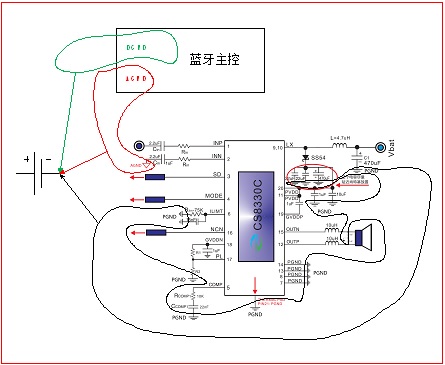 電路板上所有的器件以及單元電路都是以地線作為參考電位。原理上地線作為零電位,器件之間不會產(chǎn)生由于地線的耦合干擾。但實際是不可能的,所有引線都具有阻抗,只要地線有電流流過,就會產(chǎn)生相應的壓降。電路走線還會形成電感,這意味著電流從電源正極流向負載,然后返回電源負極,在整個電流通道上存在一定的電感。工作在較高頻率時,電感將增大地線阻抗,比如DC-DC升壓電路中電源-電感-MOS管-地通路。如果不分地,特別整個地平面不完整,音頻功放信號又是單端輸入的情況下,數(shù)字電路以及升壓電路的開關(guān)噪聲就會通過地線耦合到音頻功放的輸入端或者電源端,最終喇叭輸出明顯的底噪聲。所以分地是一個處理底噪聲的好辦法。以內(nèi)置升壓音頻功放CS8330用于藍牙音箱為例,可將整個PCB板地線分成三部分:DGND, PGND, AGND。DGND是主控數(shù)字電路部分,包括藍牙射頻部分地線可跟數(shù)字地接一起。PGND主要是音頻功放DC-DC升壓部分以及功率放大部分,包括外圍的濾波電容。充電部分可在功放的前端接一起,也可單獨一部分。AGND包括藍牙主控芯片ADC, DAC,MIC部分模擬地以及音頻功放內(nèi)部輸入端預放部分模擬地。最終DGND,PGND,AGND三大塊在電池或者電源輸入端匯總一點接地。如下圖所示: