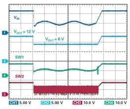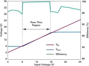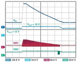 圖 2 顯示了此電路的輸入 / 輸出傳輸特性。當(dāng)輸入電壓高于直通窗口時(shí),LT8210 將其降低到穩(wěn)定的 16 V 輸出。如果輸入電壓低于直通窗口,LT8210 會(huì)增大該電壓,并將輸出保持在 8 V。當(dāng)輸入電壓在直通窗口范圍內(nèi)時(shí),頂部開關(guān) A 和 D 保持開啟,使得輸出可以跟蹤輸入,且部件可以進(jìn)入低功率狀態(tài),VIN 和 VINP 引腳上的典型靜態(tài)電流分別為 4 µA 和 18 µA。在這種非開關(guān)狀態(tài)下,既不存在 EMI,也不存在開關(guān)損耗,因此效率可以達(dá)到 99.9%以上。