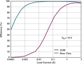 圖 5. 直通區(qū)域的效率達(dá)到將近 100%(與持續(xù)導(dǎo)通模式下的效率相比)。