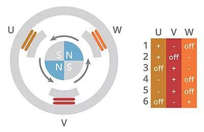 因為 BLDC 電機(jī)的轉(zhuǎn)子受旋轉(zhuǎn)的定子磁極影響,所以須追蹤定子磁極位置,以有效驅(qū)動三個電機(jī)相。為此,需使用電機(jī)控制器在三個電機(jī)相上生成六步換向模式。這六步(或換向相)移動電磁場,進(jìn)而使轉(zhuǎn)子永磁體移動電機(jī)軸。