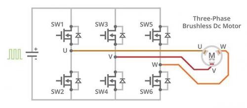 電機(jī)定子中嵌入了檢測轉(zhuǎn)子位置的霍爾效應(yīng)傳感器,這樣就可以切換三相電橋中的晶體管來驅(qū)動電機(jī)。三個霍爾效應(yīng)傳感器輸出一般標(biāo)記為 U、V 和 W 通道。雖然霍爾效應(yīng)傳感器能夠有效解決 BLDC 電機(jī)換向問題,但它們僅僅滿足了 BLDC 系統(tǒng)一半所需。